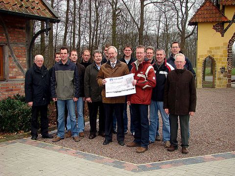 | -lz- Ochtrup. Der Welbergener Festplatz erstrahlt in neuem Glanz. Um beim Schützenfest oder beim Pfarr- und Volksfest auch bei schlechtem Wetter trockenen Fußes ins Festzelt zu kommen, wurde der Platz neu gepflastert und mit Strom- und Wasserleitungen versehen. Die eineinhalb Jahre Planung haben sich ausgezahlt: Die Bauphase dauerte durch die gute Organisation durch den Vorstand des Schützenvereins nur vier Wochen. Die Finanzierung der 10 000 Euro teuren Baumaßnahme erfolgt vorwiegend durch Spenden und Zuschüsse vom Schützenverein und aus der Pfarrfestkasse Welbergen. So überreichte die Volksbank Ochtrup bei der Besichtigung gestern einen Scheck über 2000 Euro. |