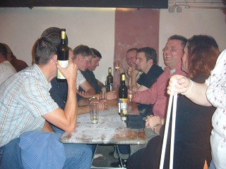 Da aber auch das eindrucksvollste Feuerwerk irgendwann zu Ende geht, ging man wieder zur Geselligkeit über. Man probierte noch den ein oder anderen Wein, fachsimpelte über den Oechslegrad oder stieg um auf alkoholfreie Getränke; während einige schon schlafestrunken eine kurze Auszeit nahmen. |