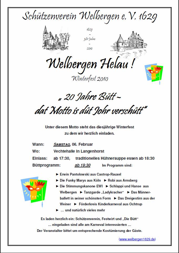 Ab 17.30 Uhr ist Einlass in die Vechtehalle Langenhorst und ab 18.30 kann die Hühnersuppe eingenommen werden. Gegen 19.30 startet das Büttprogramm, moderiert durch Ansgar Stücker und Thomas Schlattmann. Auch in diesem Jahr haben es sich einige Akteure aus Welbergen, nicht nehmen lassen in die Bütt zu gehen.