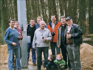 Bild rechts: An der neuen Vogelstange; v. l.: „Shaky„ Averbeck, Werner Barkling, Thomas Schlattmann, Mark Holtmann, Werner Hinkers, Manni Hoffstedde, Werner Ratering, Alfred Weßling, Vorne: Antonius Hoffstedde und Lennart Vollenbröke |