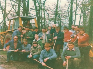 Bild links: Auf dem Trecker: Josef Hundehege; hintere Reihe v. l.: Alfred Weßling, Willi Tihatmer, Heinrich Möllerwessel, Aloys Wieling, Heinrich Stücker mit Sohn Dietmar, Bernhard Weßling, Walter Walier, unbekannte Person, Heinz Mathmann, Ludger Rehers; vorne Werner Hinkers, Hermann Focke, Michaela Hinkers, Bernhard Holtevert, Josef Meier |