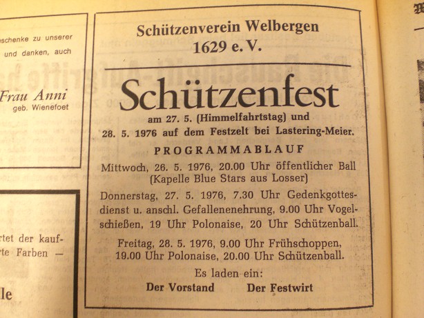Donnerstag, 27.5.1976, 7.30 Uhr Gedenkgottesdienst u. anschl. Gefallenenehrung, 9.00 Uhr Vogelschießen, 19 Uhr Polonaise, 20 Uhr Schützenball.