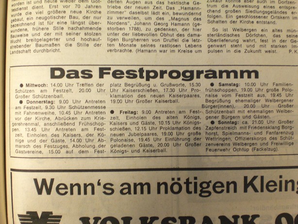 Samstag: 10.00 Uhr Familienfrühschoppen, 19.00 Uhr große Polonaise vom Festzelt aus, 19.45 Uhr Begrüßung ehemaliger Welbergener Bürger(innen), 20.00 Uhr Großer Schützenball mit ehemaligen Welbergener Bürgern und Gästen.
