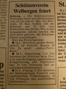 19.5., Mittwoch, großer Schützenball im Festzelt. Beginn 20 Uhr. Es spielt: "Jackys-Party-Band."