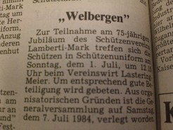 Zur Teilnahme am 75-jährigen Jubiläum des Schützenverein Lamberti-Mark treffen sich die Schützen in Schützenuniform am Sonntag, dem 1. Juli, um 12.15 Uhr beim Vereinswirt Lastering-Meier. Um entsprechend gute Beteiligung wird gebeten. Aus organisatorischen Gründen ist die Generalversammlung auf Samstag, dem 7. Juli 1984, verlegt worden. |