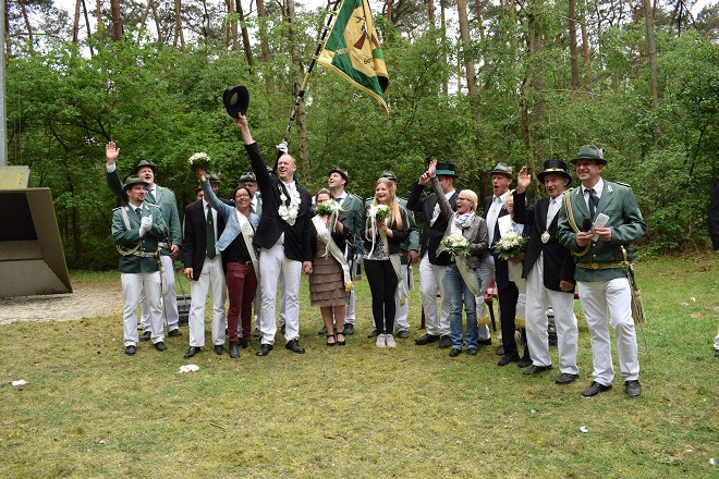Ein Rockstar mit dem man erst wohl nicht gerechnet hatte. Denn während sich rund 12 Schützen in der finalen Phase des Vogelschießens Runde um Runde anstellten, um dem Federvieh den Garaus zu machen, machte „Schleiten“ alles richtig: Statt wie zwei seiner Brüder und die zehn anderen Schützen es mehrmals zu versuchen, ging er einfach zur richtigen Zeit zur Stange, schoss – und der Vogel war unten. Nicht nur die drumherum stehenden Schützen hatten „Schleiten“ nicht auf dem Plan – auch seine Freundin Carmen weilte noch nichtsahnend daheim in Bramsche, als sie die Nachricht von ihrer zukünftigen Königinnenwürde erreichte. |